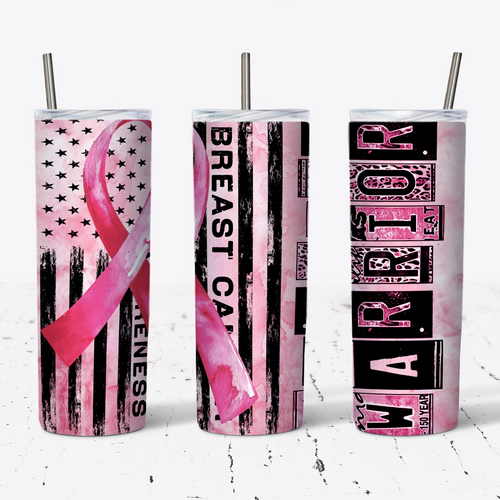 Pink Breast Cancer Warrior and Flag Style Tumbler w/ Lid & Straw
