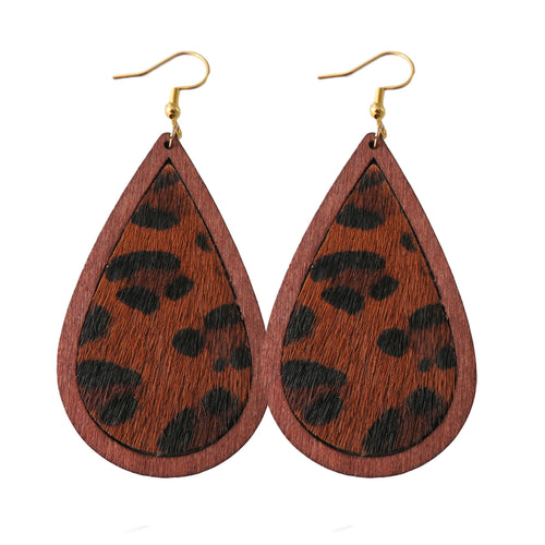 Wood Lined Faux Horse-Hair Brown Leopard Print Tear Drop Earrings