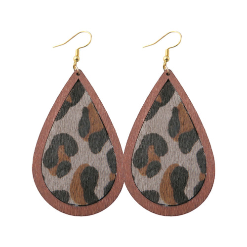 Wood Lined Faux Horse-Hair Brown/Gray Leopard Print Tear Drop Earrings